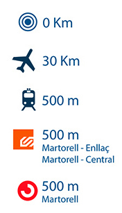 Ubicado a las afueras de Barcelona a 30 minutos en coche del centro de la ciudad condal, a 30 minutos en coche del aeropuerto de Barcelona-El Prat y a 100m de la estaciones de tren de Cercanías Renfe y FGC, que conectan con el centro de Barcelona en 35 minutos.